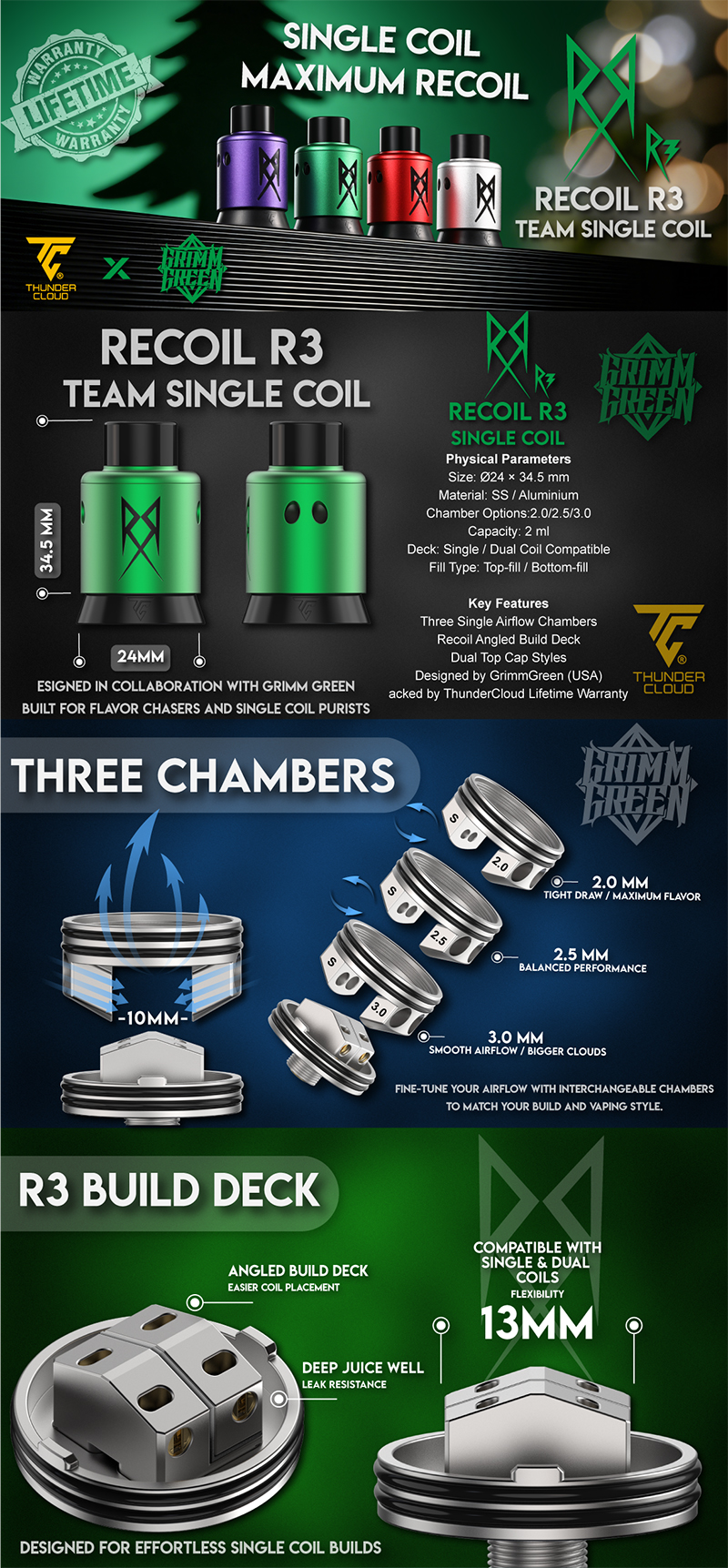 Authentic Thunder Cloud x GrimmGreen Recoil R3 TSC 24mm RDA Atomizer 2ml with BF Pin